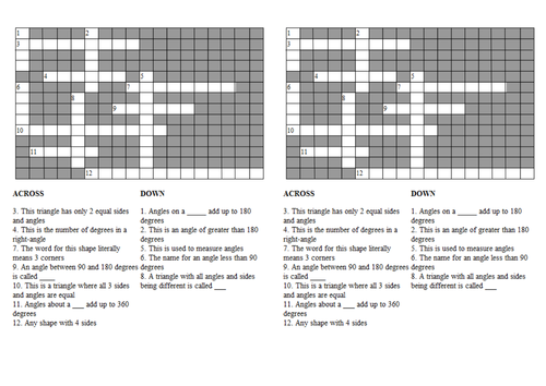 Maths Literacy Puzzle Angles Crossword Teaching Resources