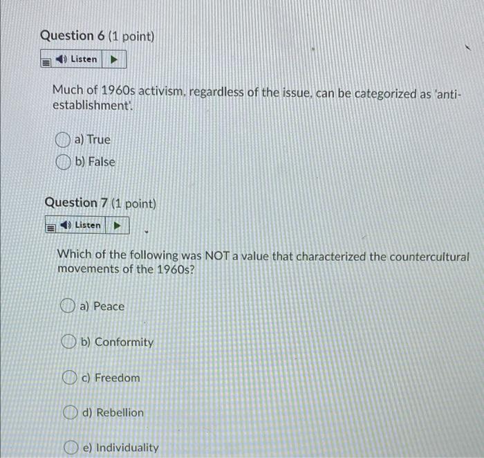 Question 6 (1 point) Listen → Much of 1960s activism Chegg com
