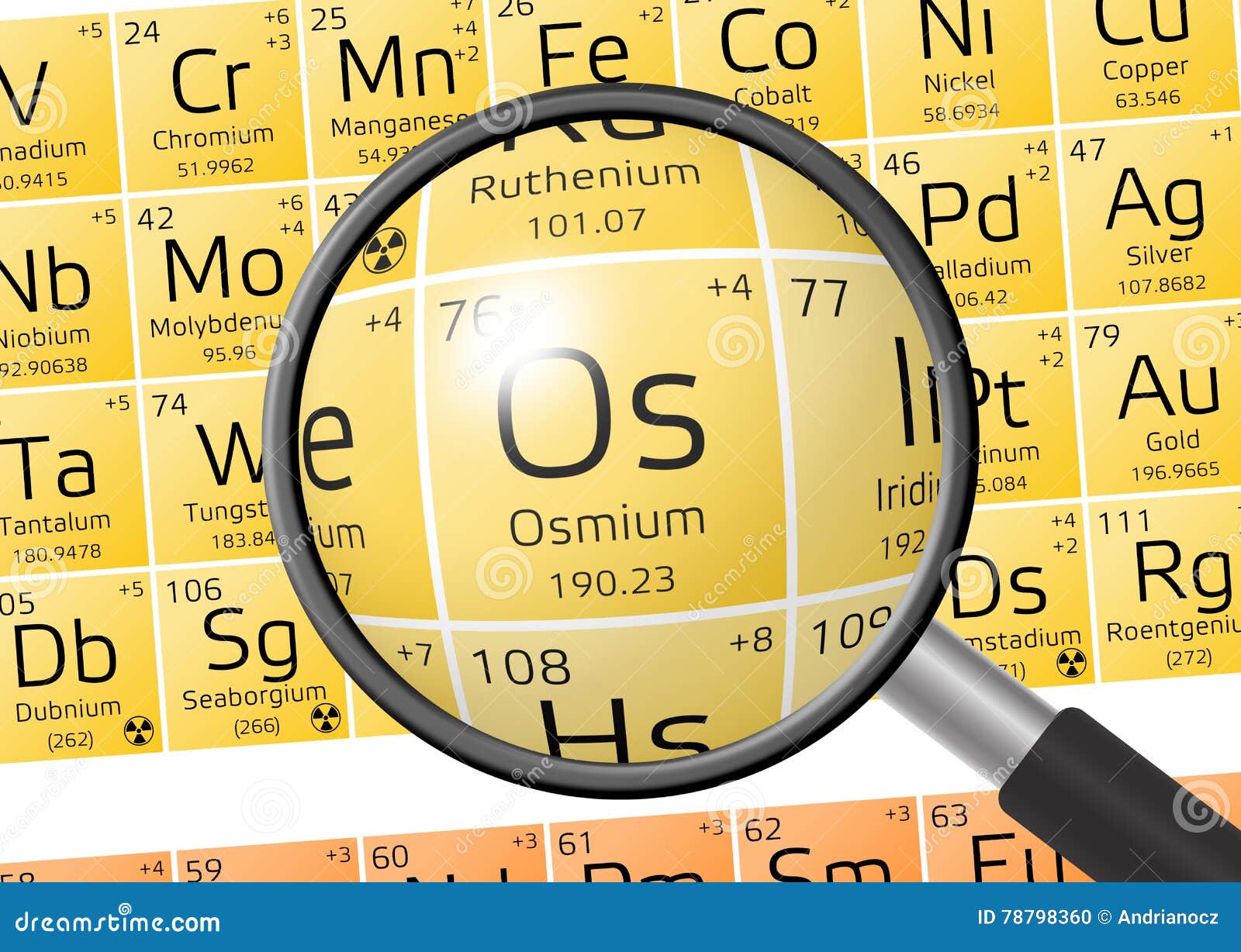 Element of Osmium with Magnifying Glass Stock Illustration