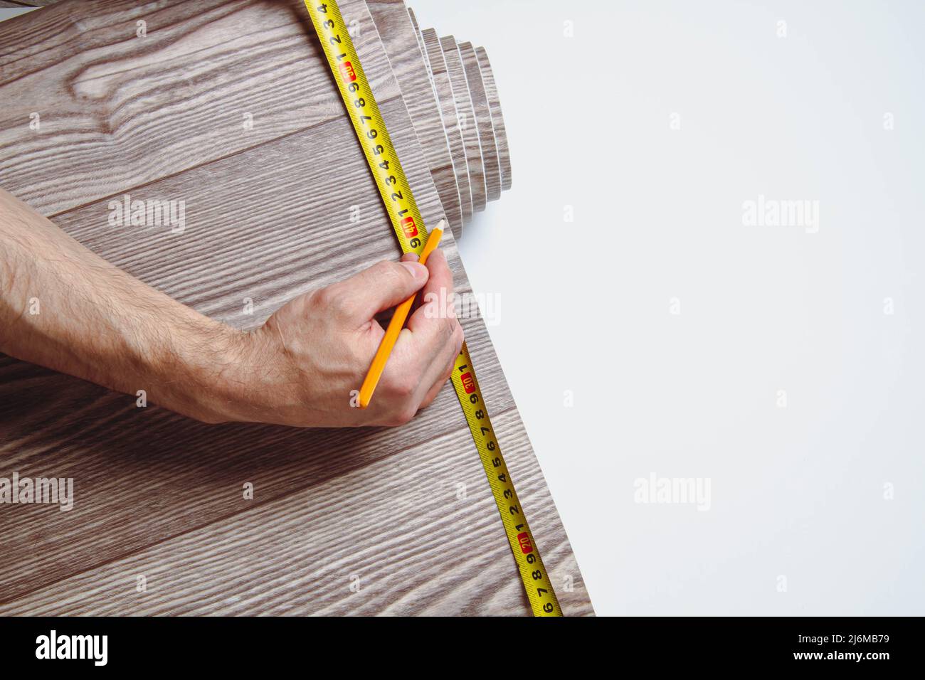 Measurement of linoleum on a cut Man cuts linoleum Tape measure and a