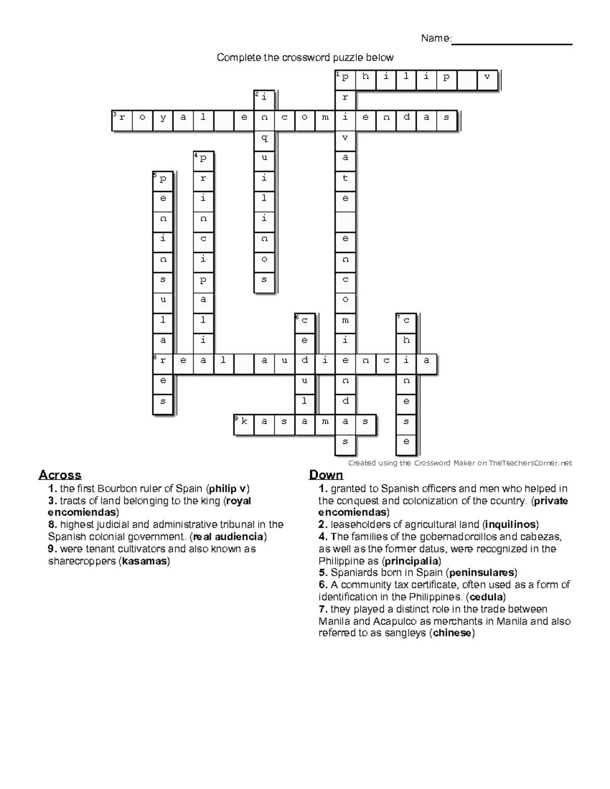 Crossword Activity answer key Complete the crossword puzzle below