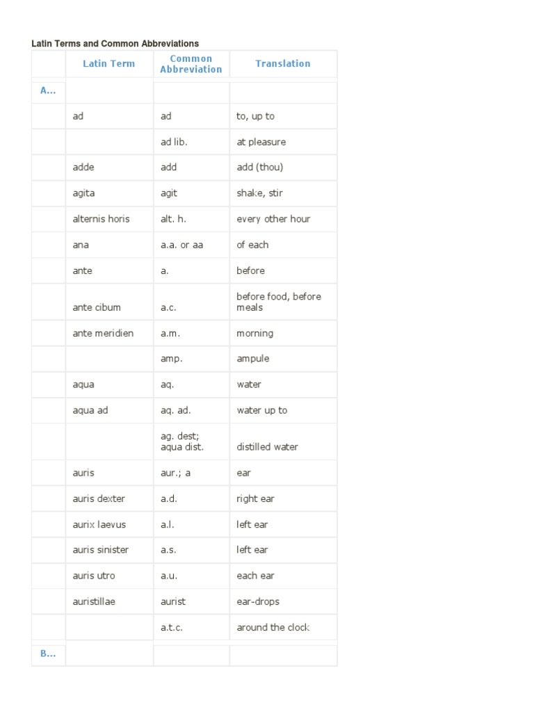 Latin Term Common Abbreviation Translation A PDF Pharmaceutical