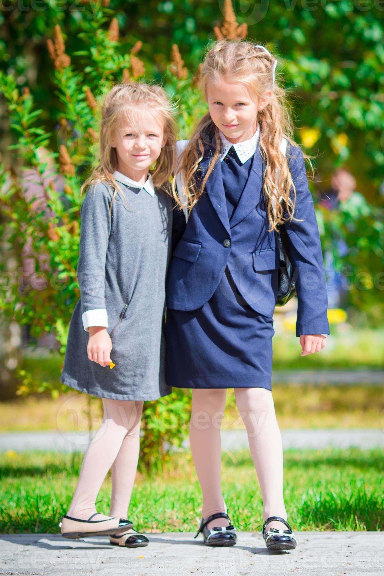 Two cute smilling little girls posing in front of their school