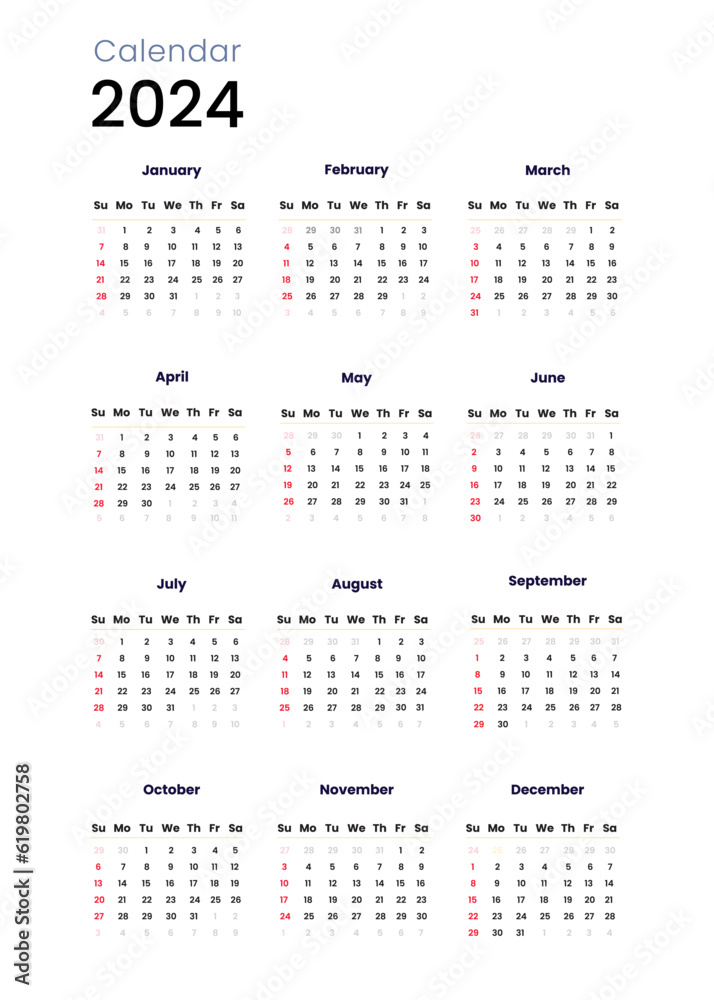 2024 Calendar year vector illustration week starts on Sunday Simple