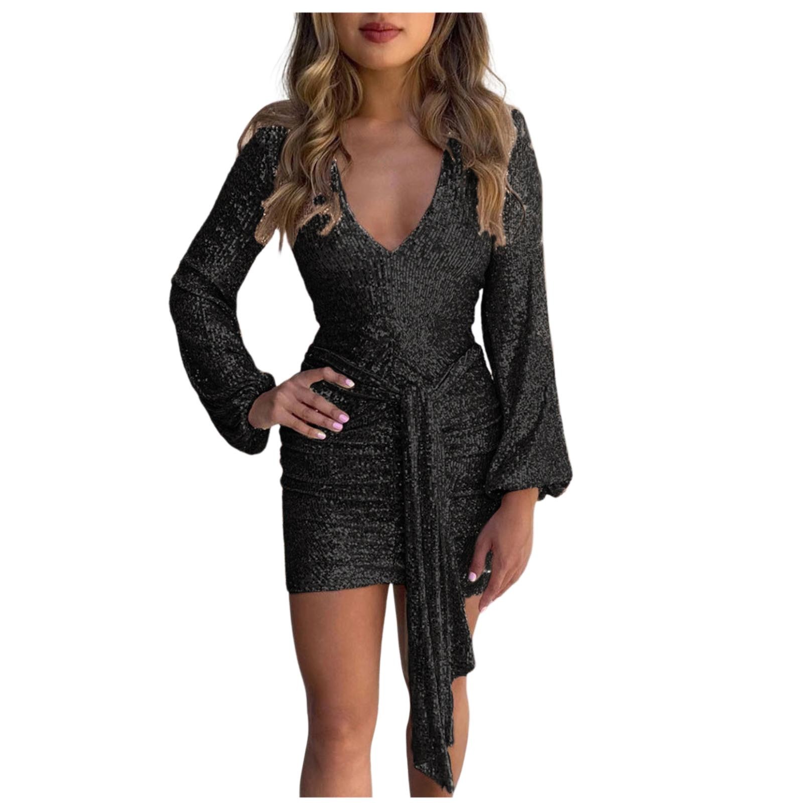 FEIFLY Dress Long Sleeve Women Deep V Neck Dress Nightclub Solid Color
