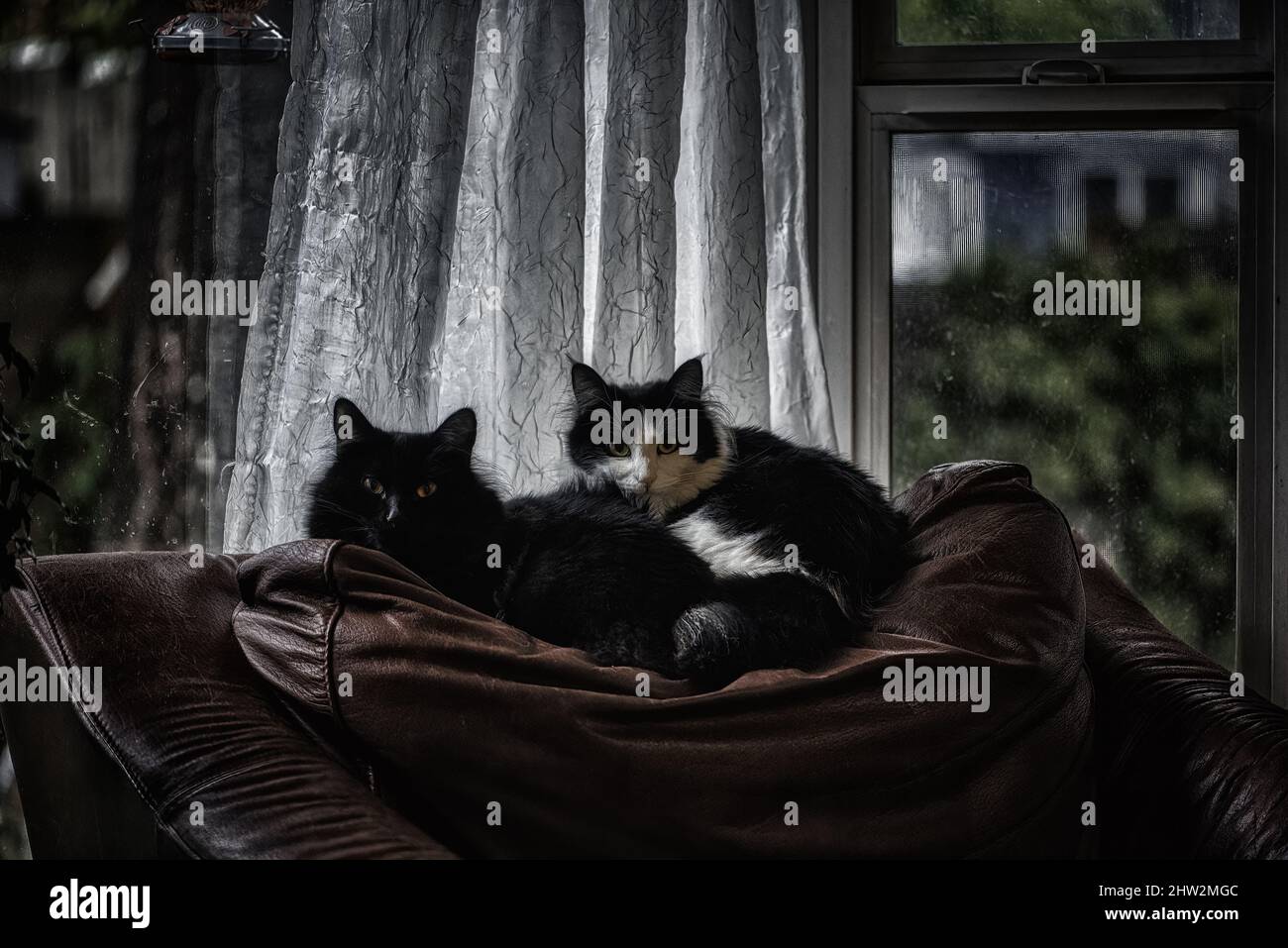 Two domestic long haired cats laying on the couch inside the house by