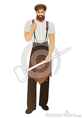 Blacksmith With Beard And Beret Wearing Retro Work Clothes And Holding