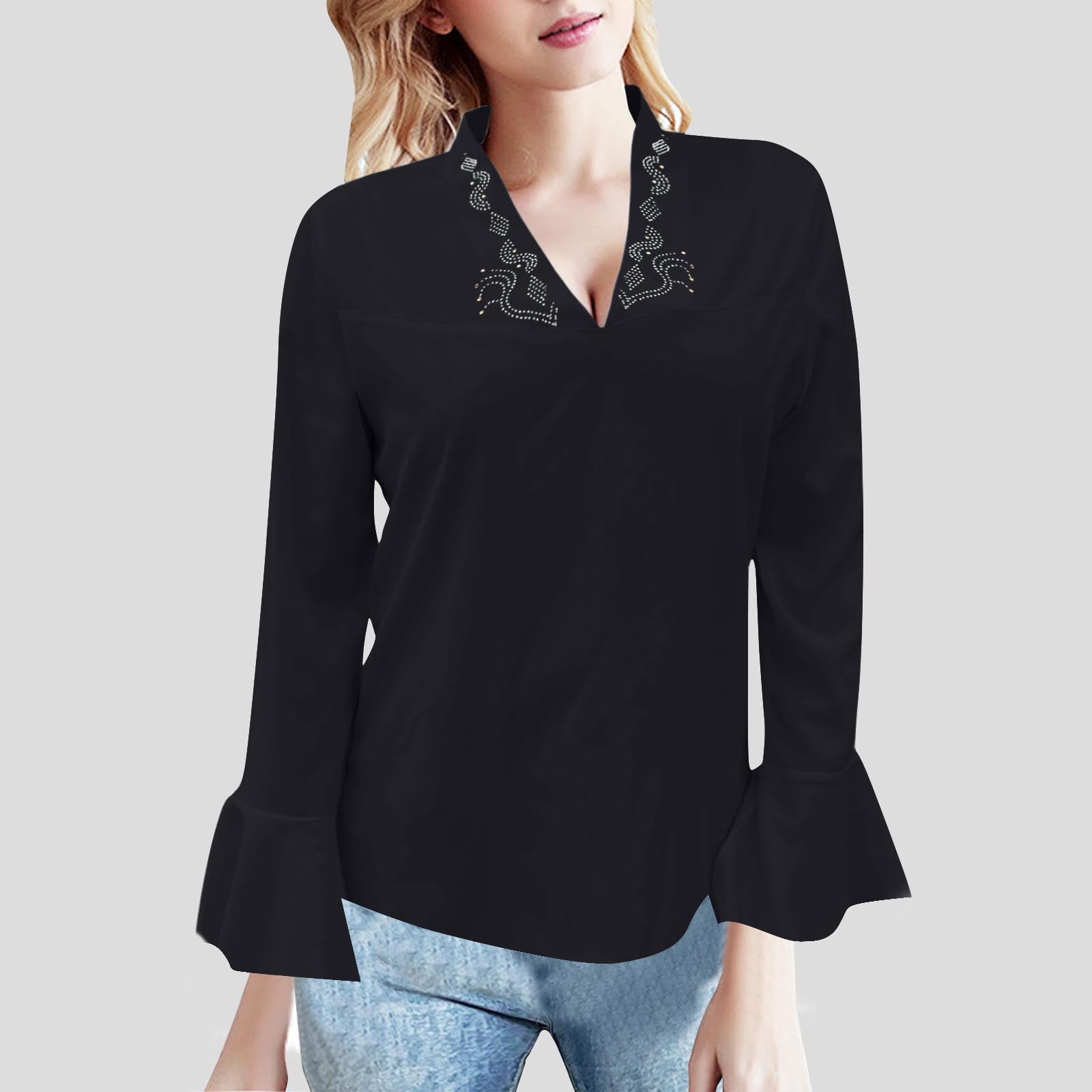 Blmnix Y2k Tops for Women Bell Sleeve Solid Color Polo Tees Long Sleeve