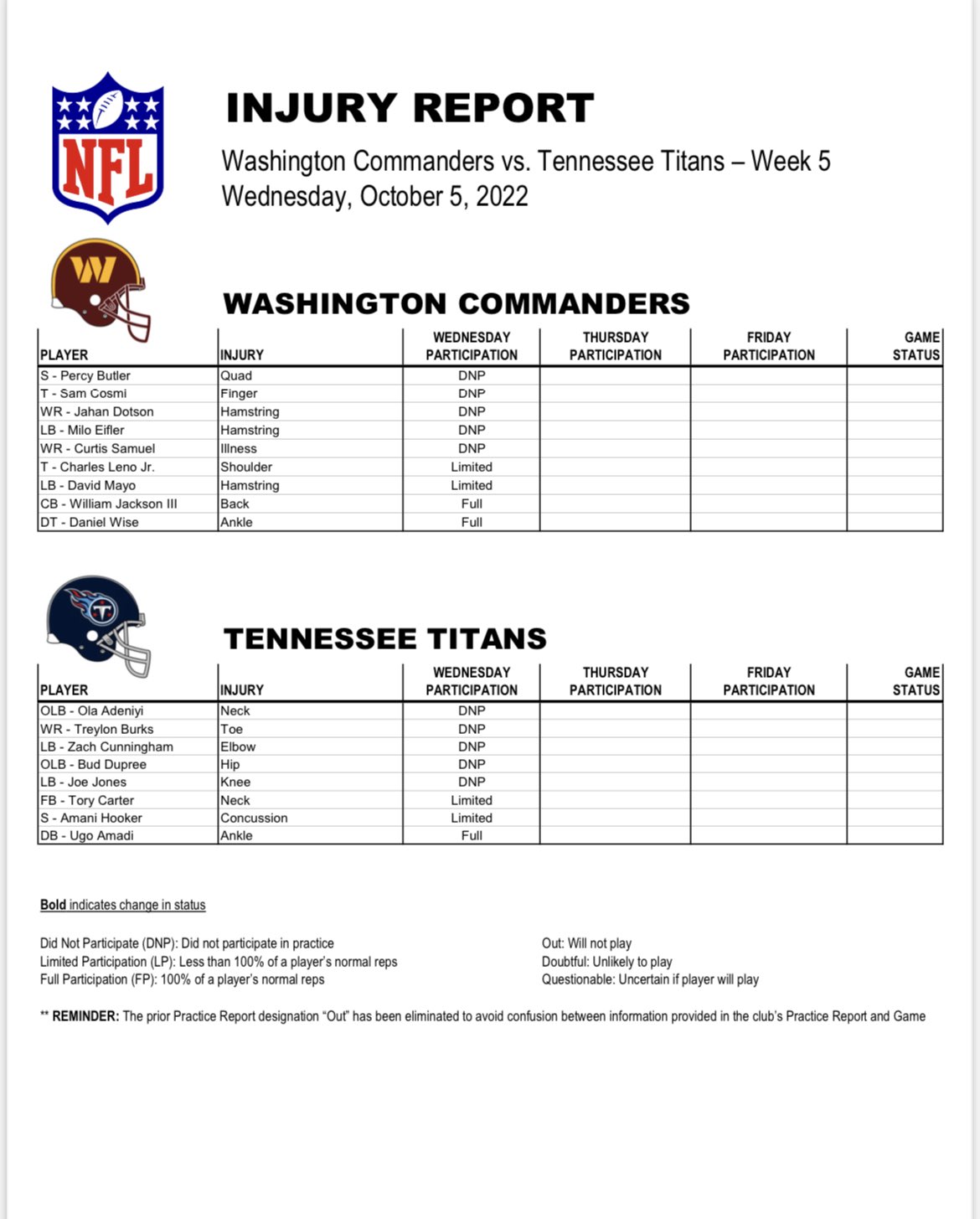 Washington Commanders PR on Twitter: quot Injury Report: https://t co