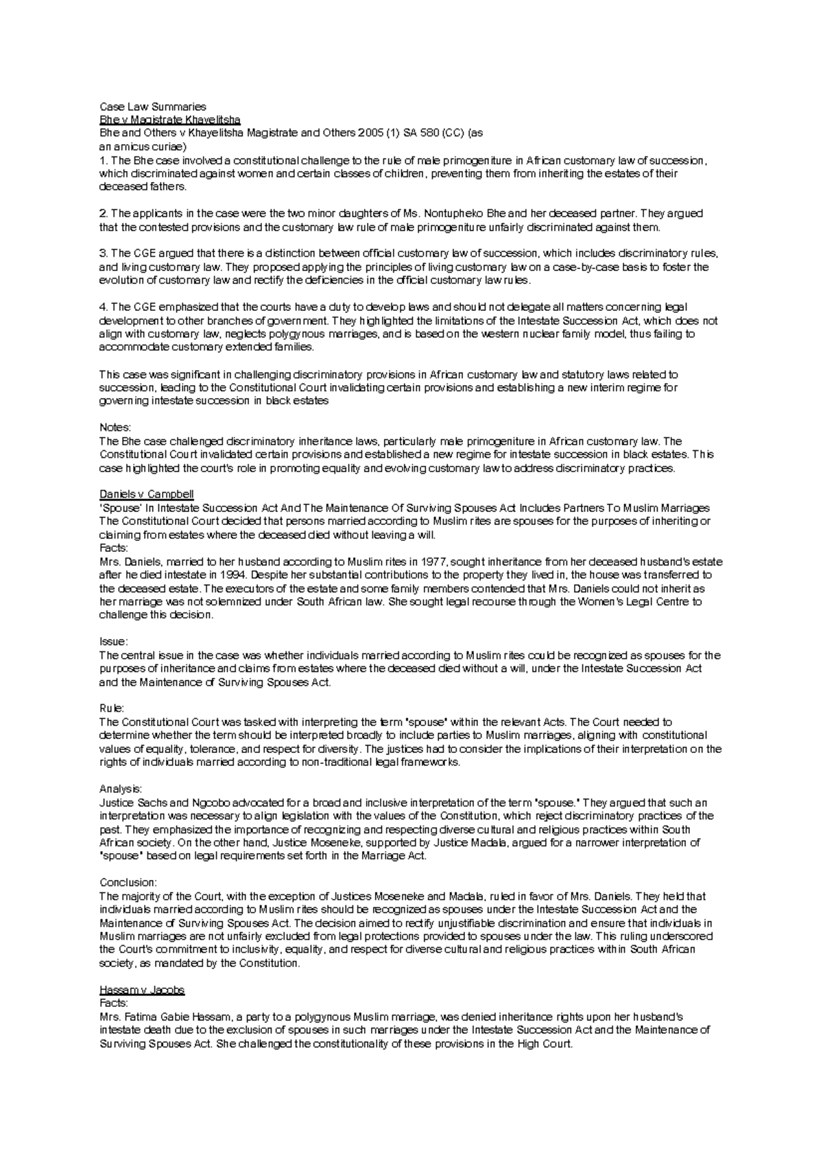 LOS Cases Case Law Summaries Bhe v Magistrate Khayelitsha Bhe and