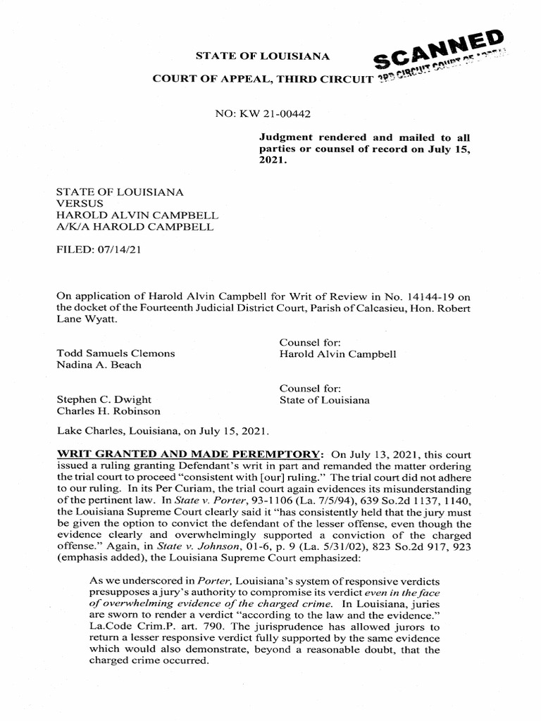 Louisiana Third Circuit Court of Appeal Writ Ruling in Harold Campbell