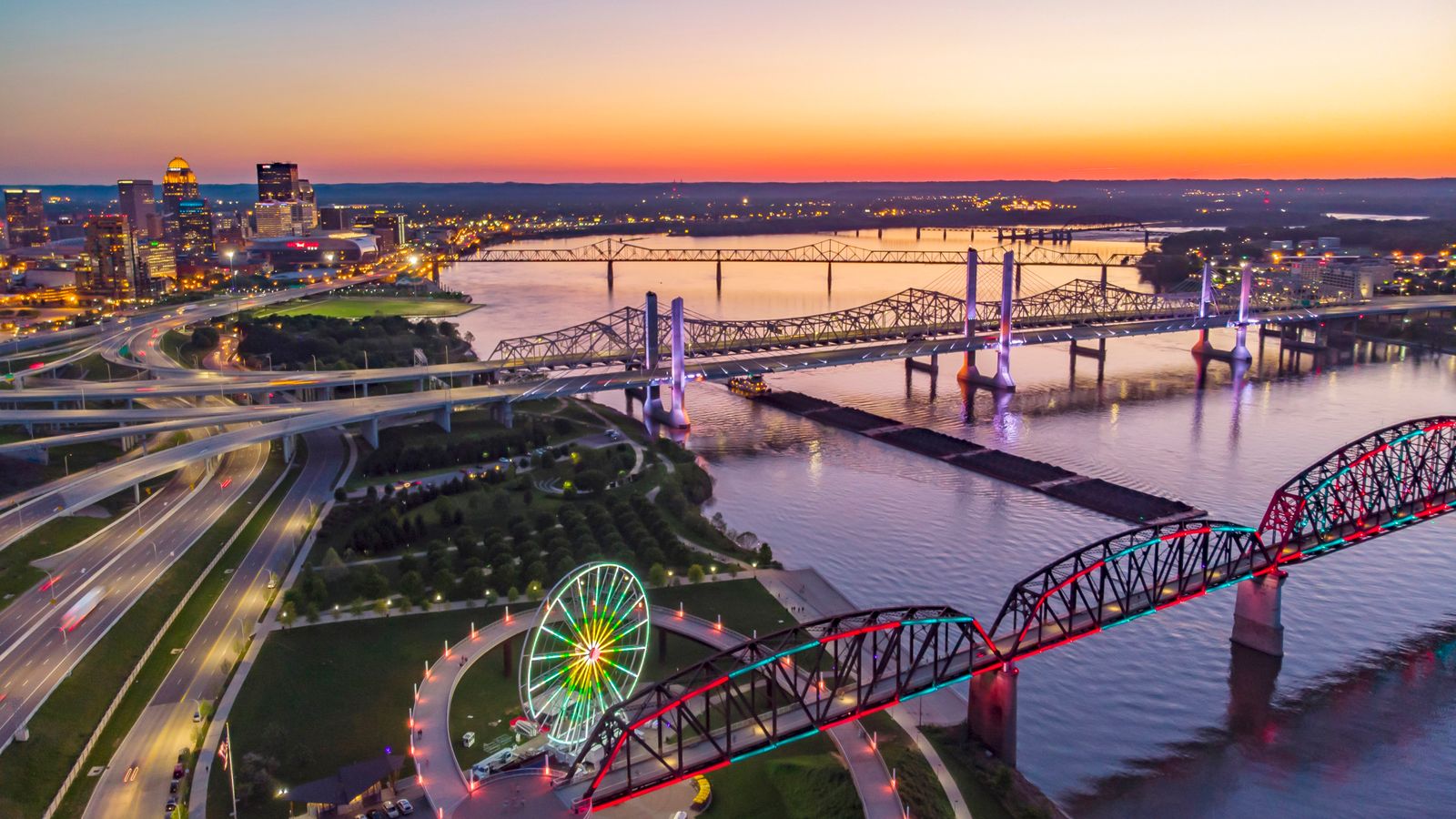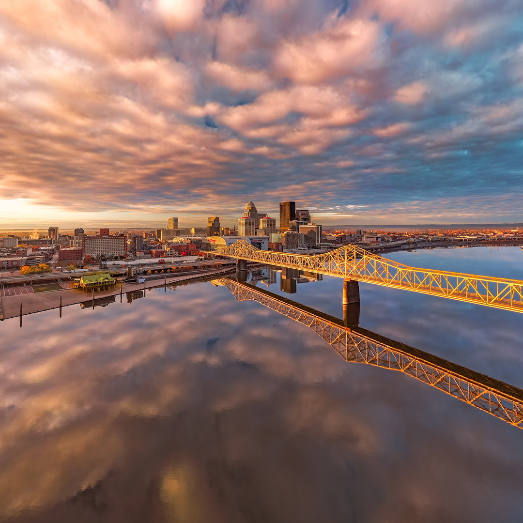 Aerial shot of the skyline of Louisville and the bridge at sunrise