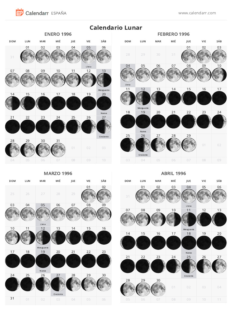 Moon Phases Calendar January 1996 Lunar Calendar 1996 January