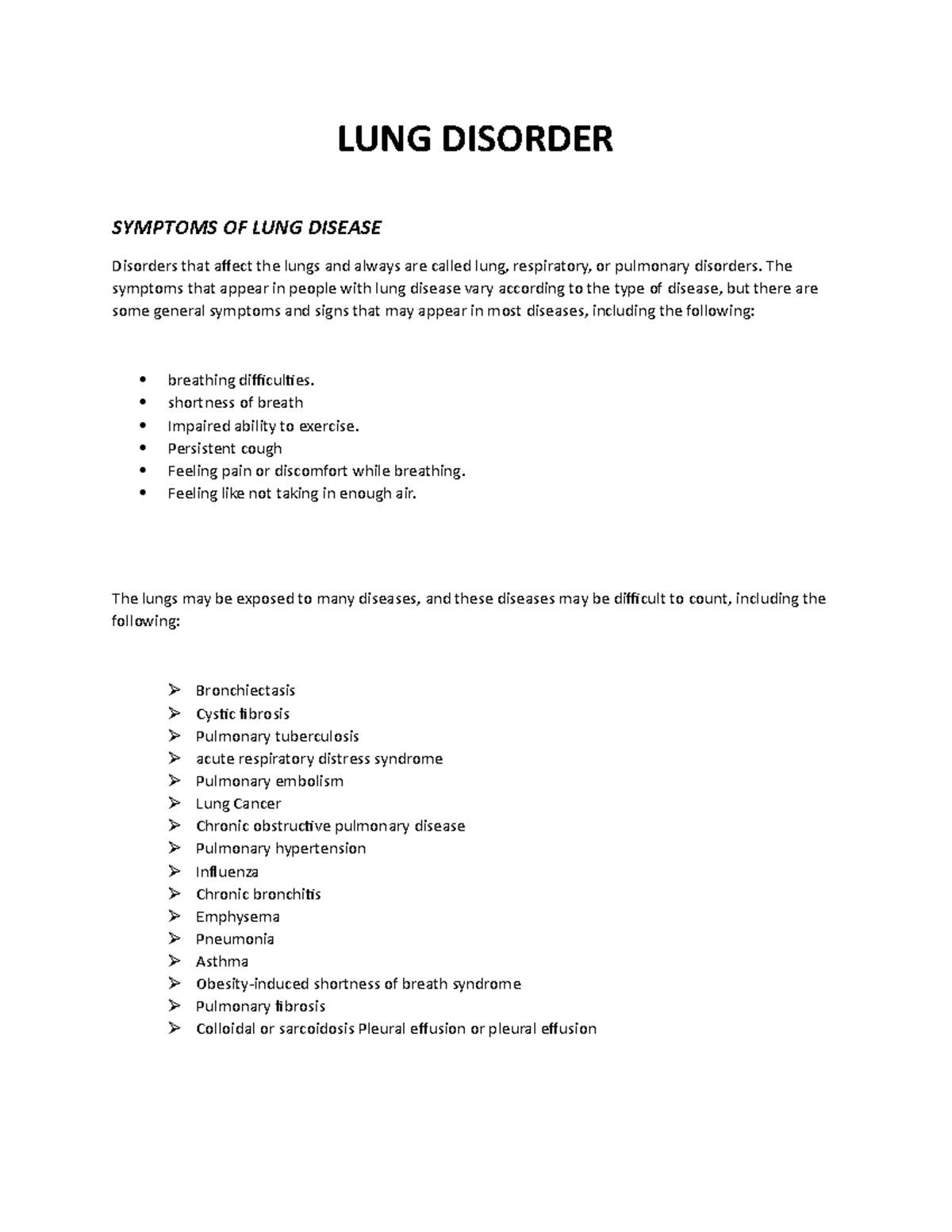 LUNG Disorder Biology grade 11 Assignment LUNG DISORDER SYMPTOMS
