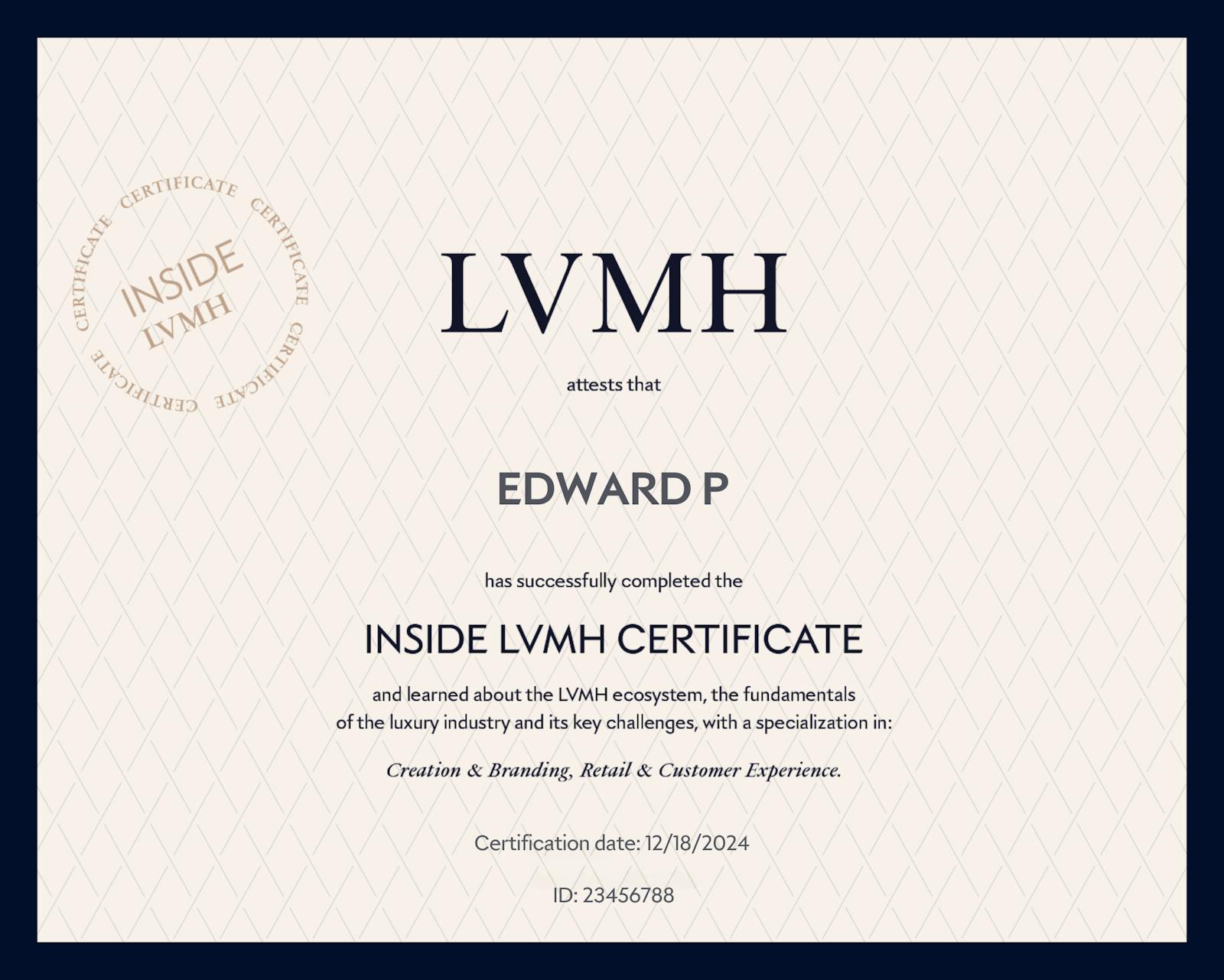 Chamberlain Hayford on LinkedIn: Obtained the LVMH INSIDE CERTIFICATE 🏅