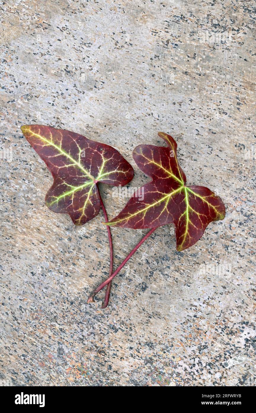 Two burgundy red leaves of Ivy or Hedera helix lying face down with