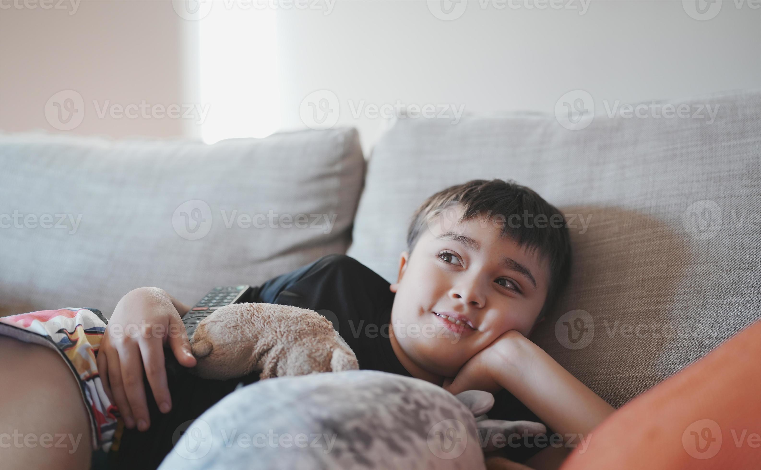 Sad boy cuddle teddy bear laying down on loor in play room Lonely kid
