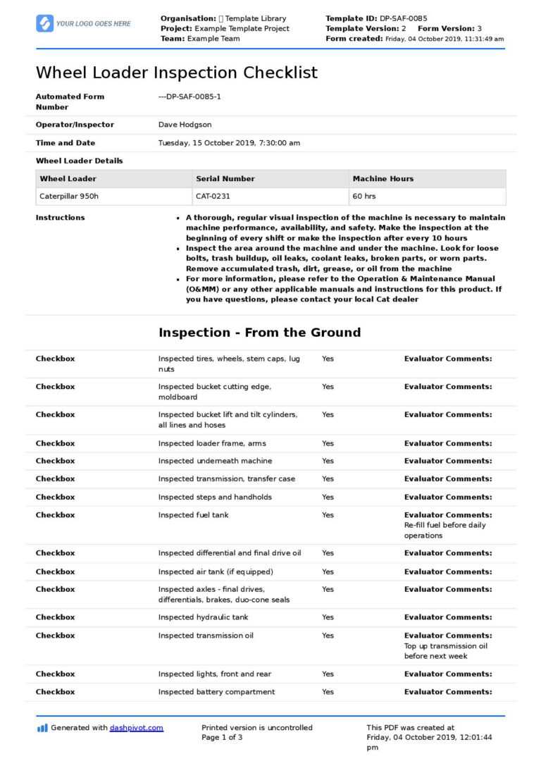 Wheel Loader Inspection Checklist: Free Editable Form Template