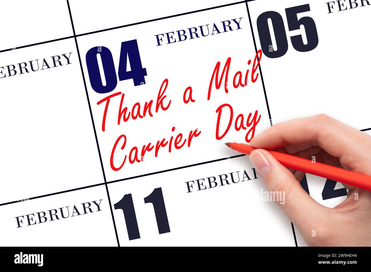 February 4 Hand writing text Thank a Mail Carrier Day on calendar date