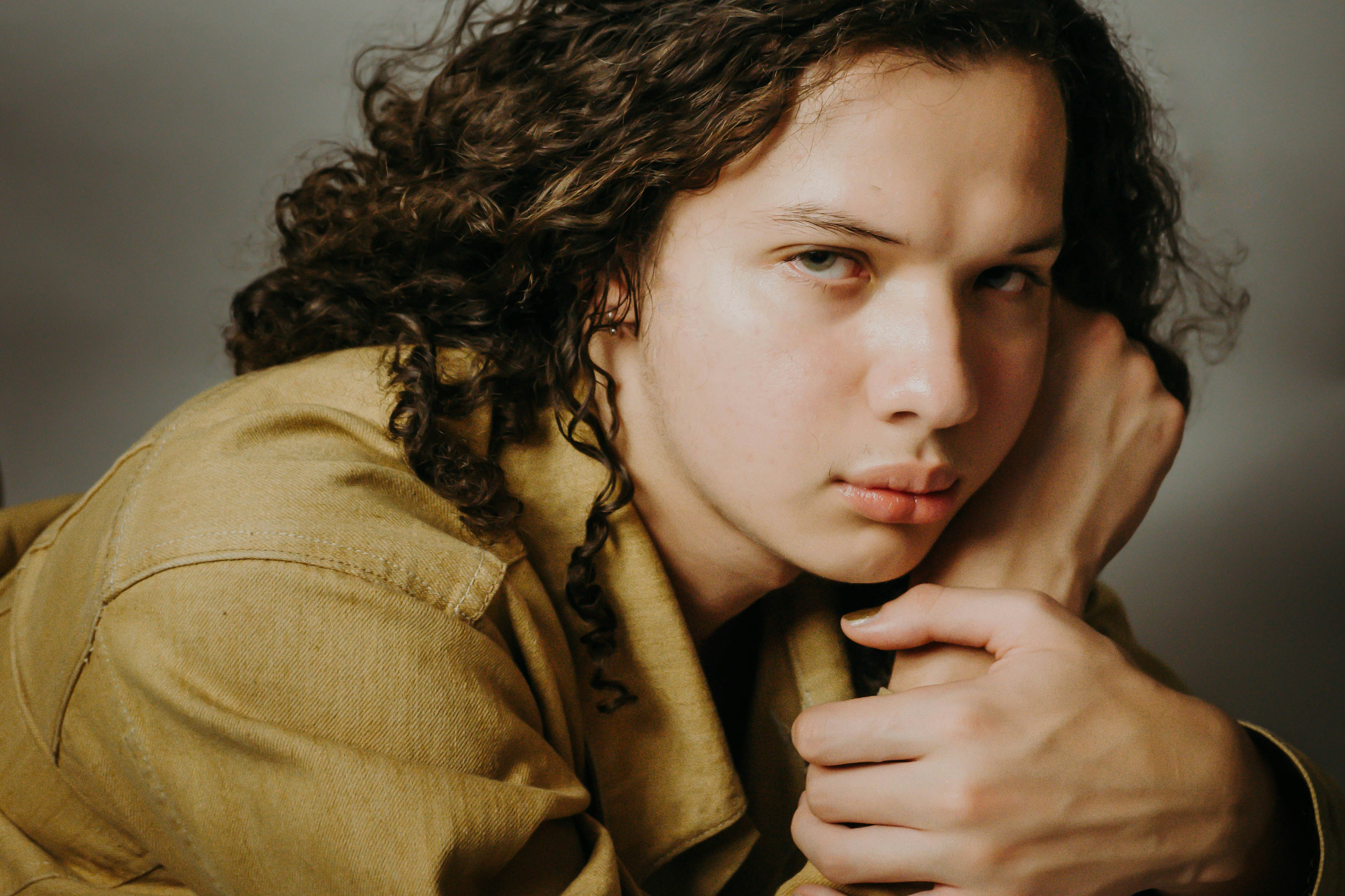 A woman with curly hair posing for a picture photo Free Portrait