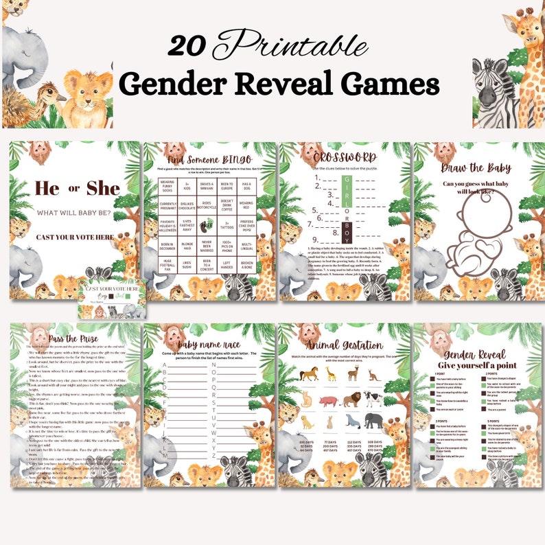 20 Gender Reveal Games SAFARI THEME Perfect for Reveal Party or Baby