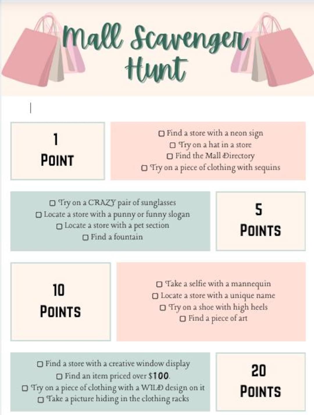 Mall Scavenger Hunt Printable