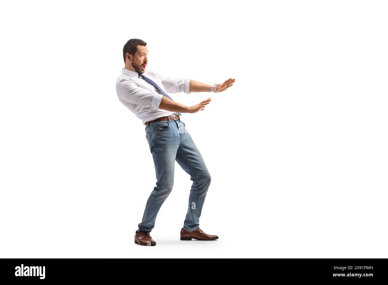 Scared young man defending himself isolated on white background Stock