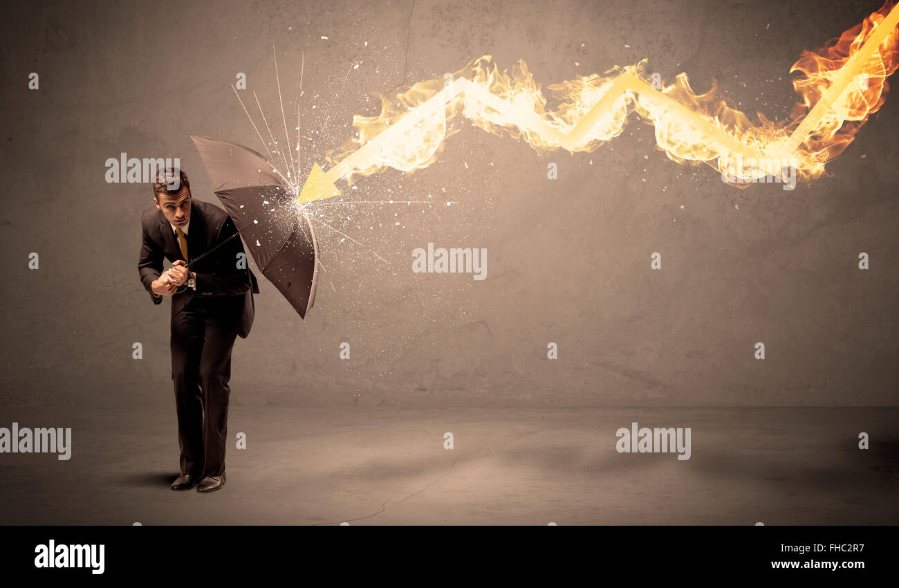 Business man defending himself from a fire arrow with an umbrella Stock
