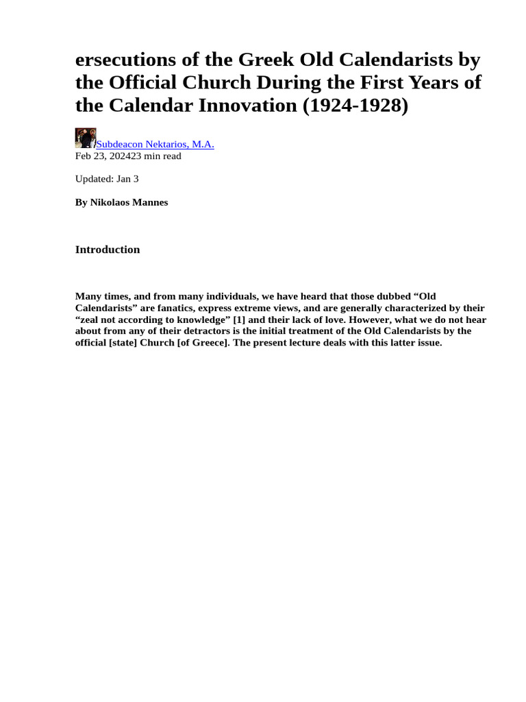 Mannes N Persecutions of The Greek Old Calendarists by The Official