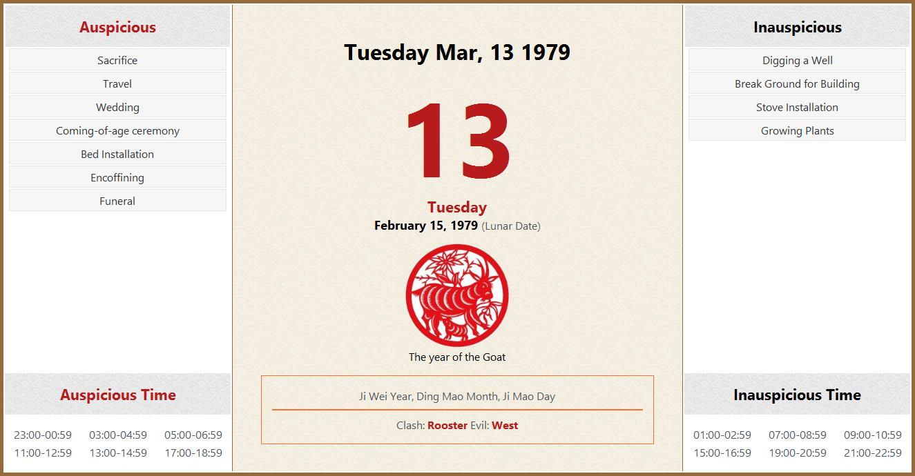 March 13 1979 Almanac Calendar: Auspicious/Inauspicious Events and
