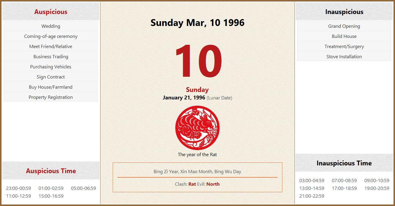 March 10 1996 Almanac Calendar: Auspicious/Inauspicious Events and