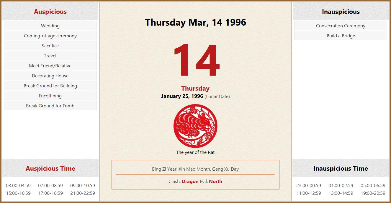 March 14 1996 Almanac Calendar: Auspicious/Inauspicious Events and