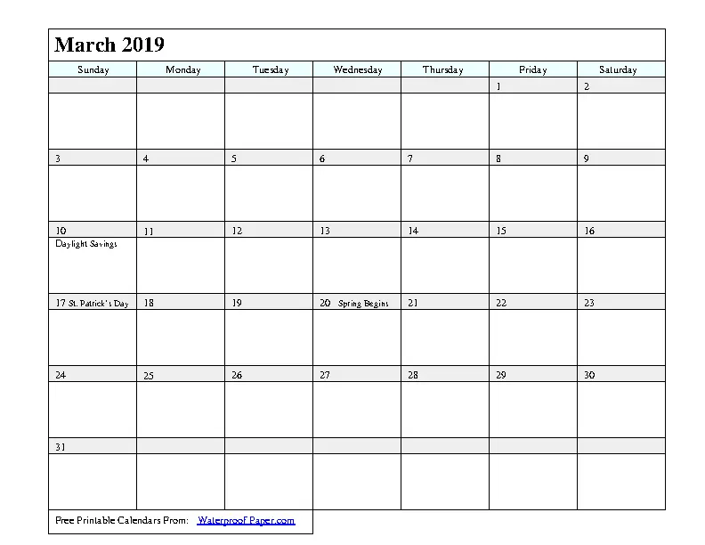 Free Monthly Printable Blank Calendar for March 2019 Monday to Sunday
