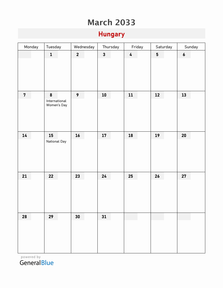 Hungary March 2033 Calendar with Holidays (Monday Start)