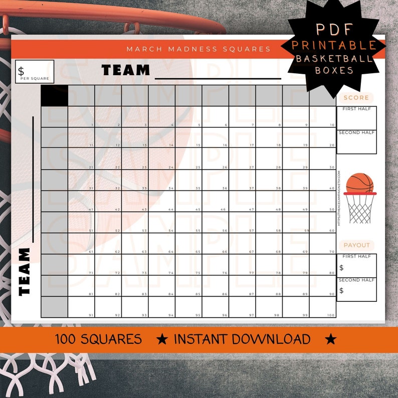 Printable Basketball Squares Game Basketball Pool Grid 100 Squares