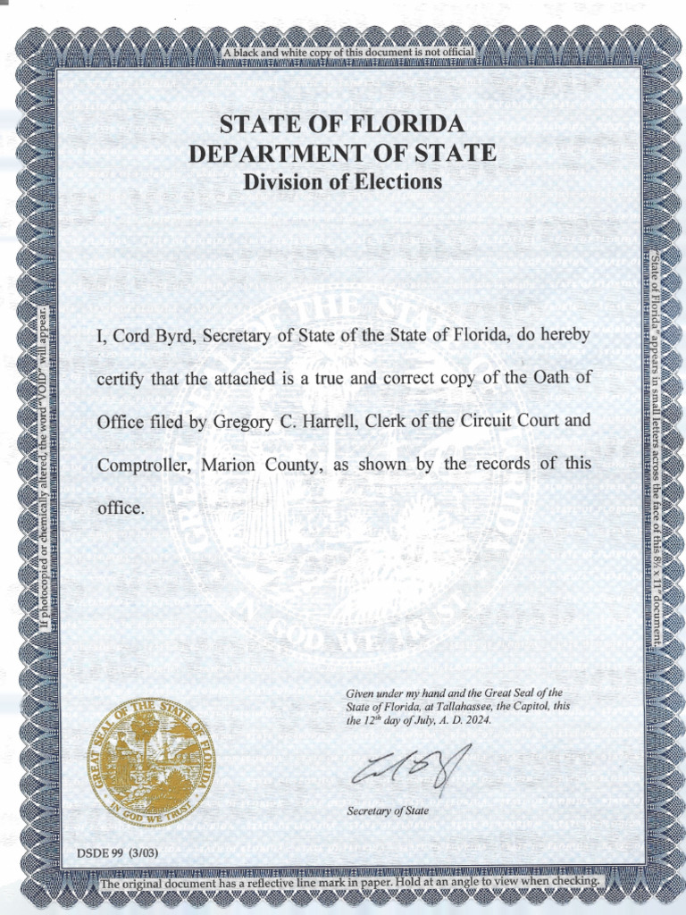 Certified Oath of Office for Marion County Florida Clerk of Courts