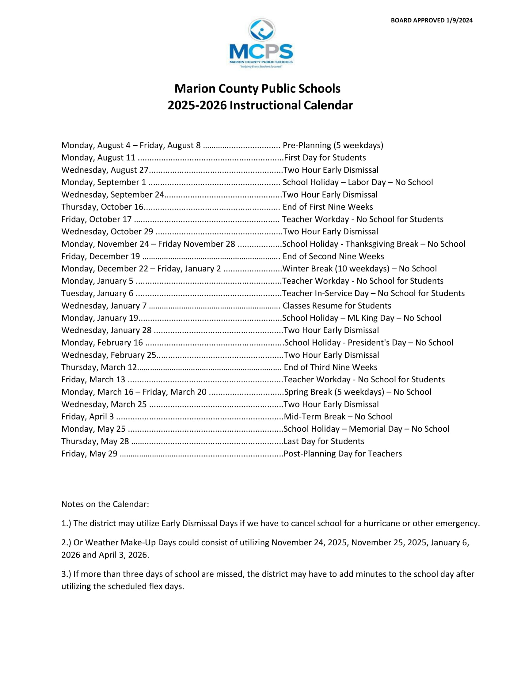 Marion County Public Schools Calendar Holidays 2025 2026 New School