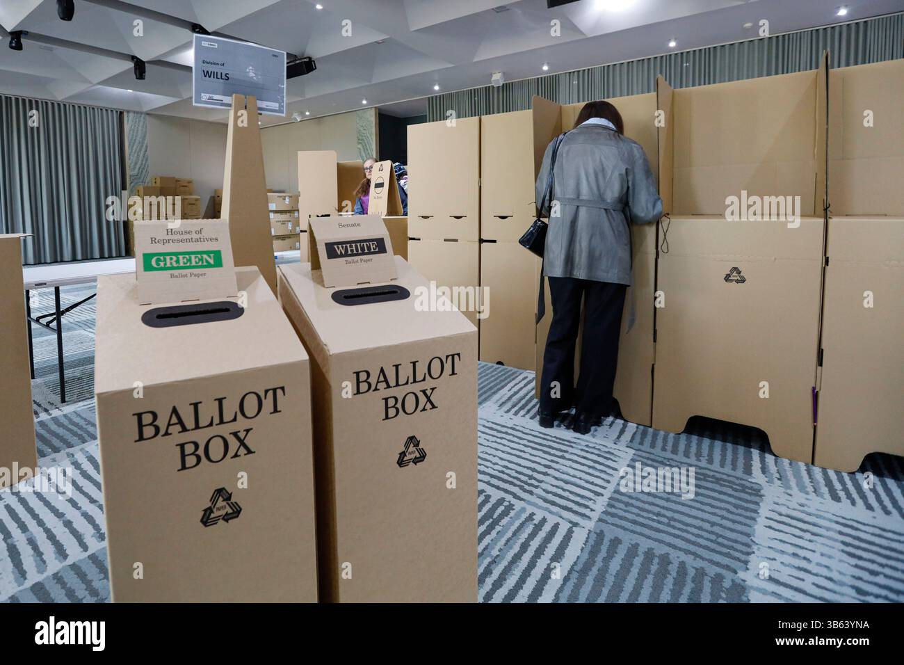 A voter marks a ballot paper in a private booth on election day during
