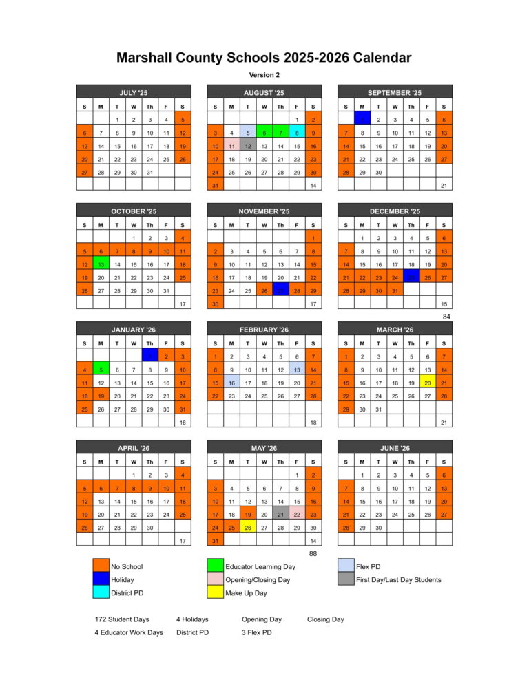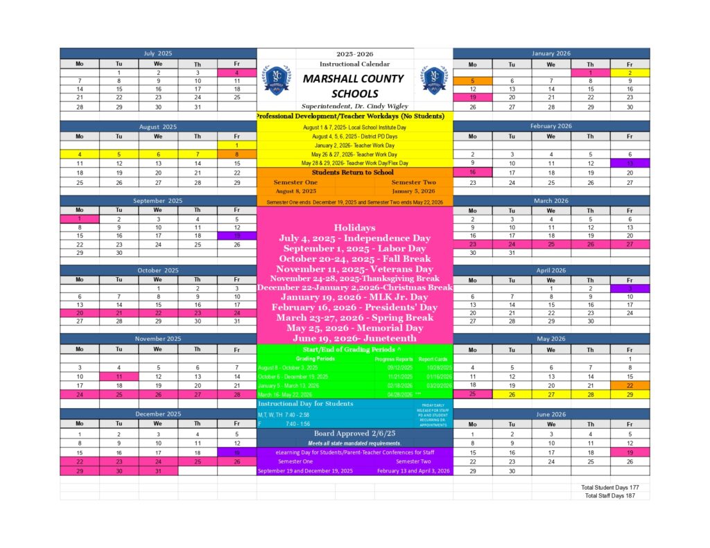 Marshall County Schools 2025 2026 School Calendar Mary Reid School