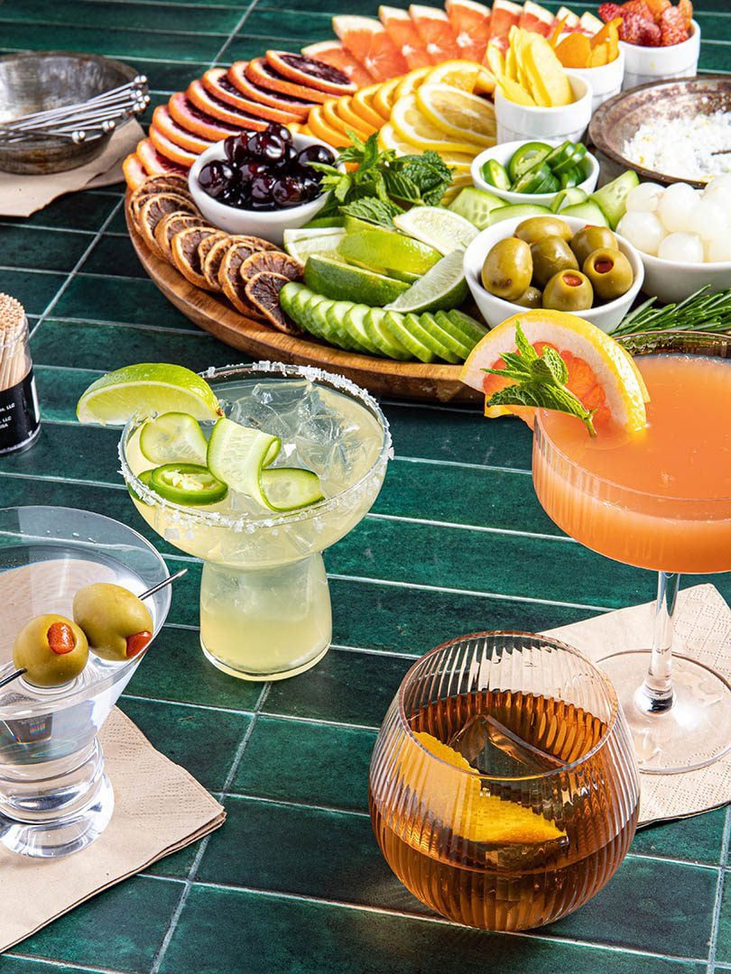 Traditional Martini Cocktail with Olive Garnish and Charcuterie Board