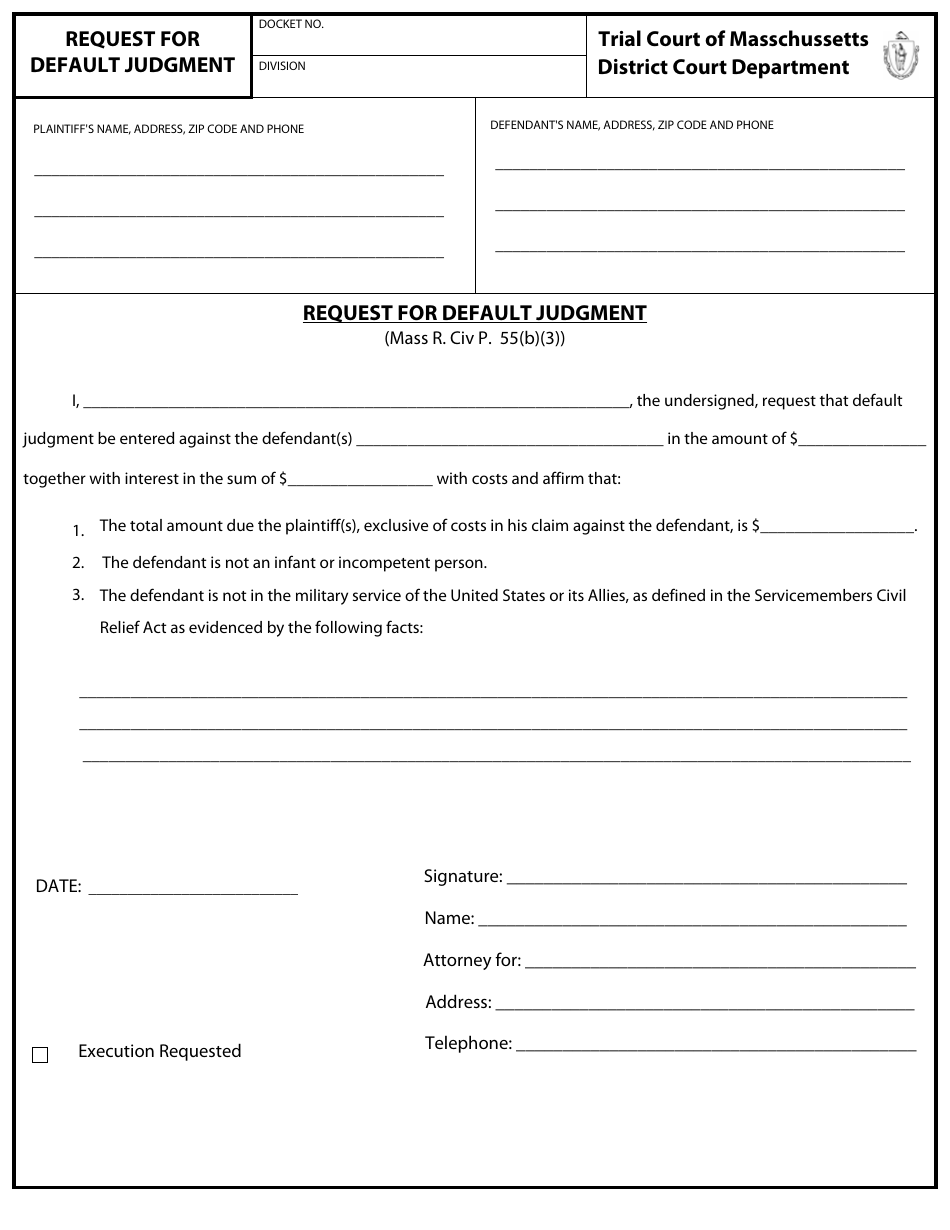 Massachusetts Request for Default Judgment Fill Out Sign Online and