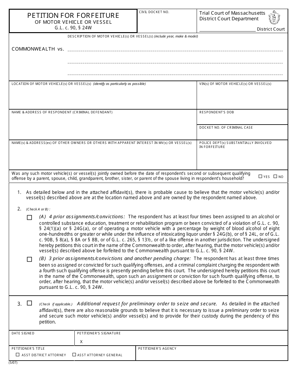 Massachusetts Petition for Forfeiture of Motor Vehicle or Vessel Fill