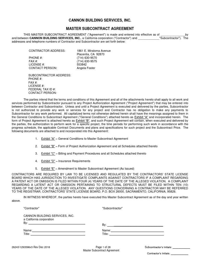 Master Subcontract Agreement Template