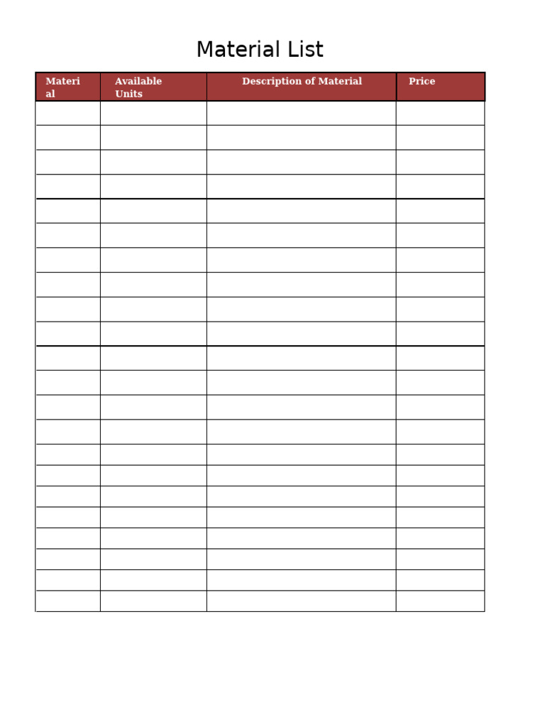 Material List Template PDF