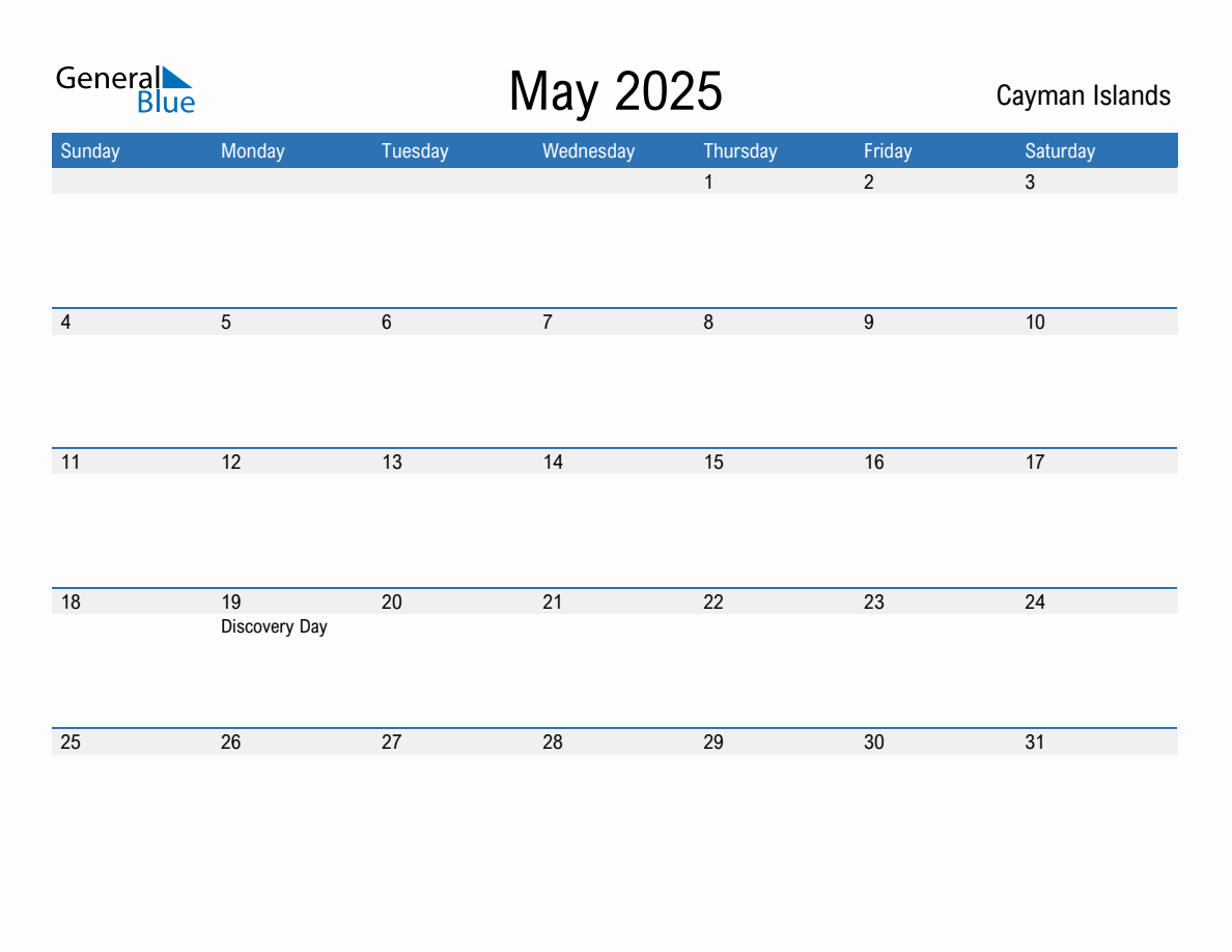 May 2025 Monthly Calendar Template with Holidays for Cayman Islands