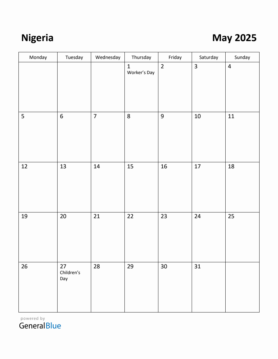 Free Printable May 2025 Calendar for Nigeria (Monday Start)