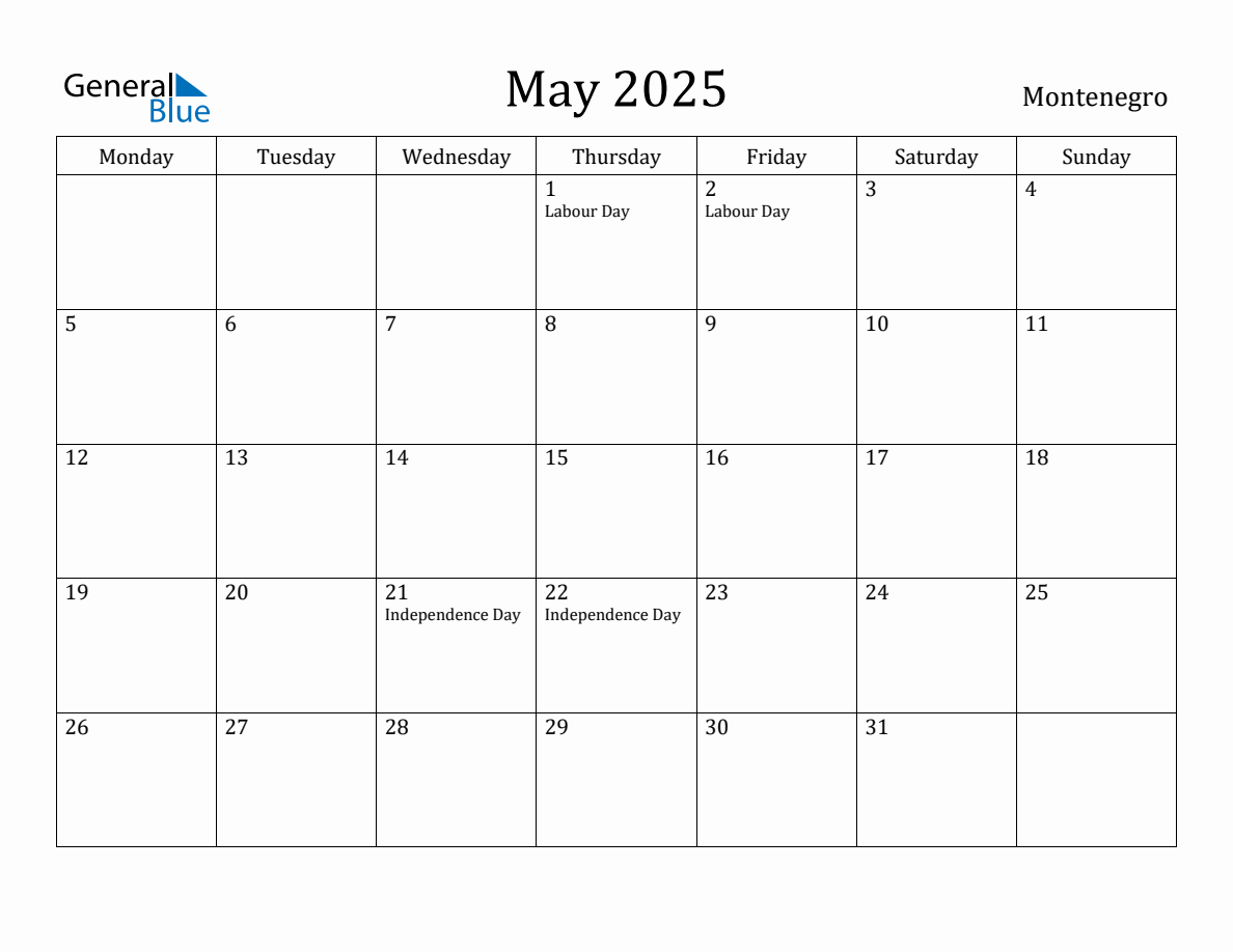 May 2025 Monthly Calendar with Montenegro Holidays (Monday Start)