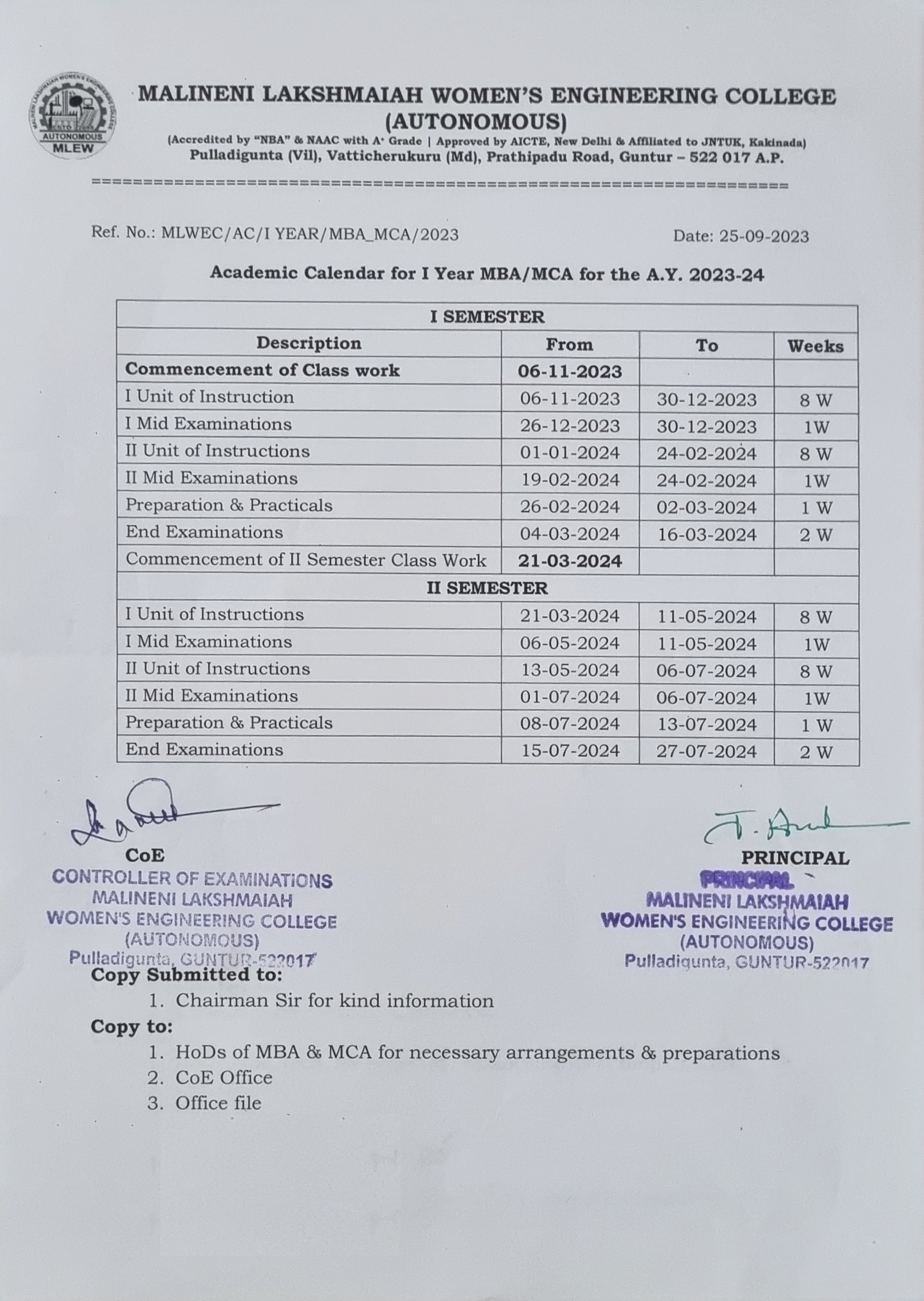 JNTU ANANTAPUR : MBA/MCA Academic Calendars for the Academic Year 2011
