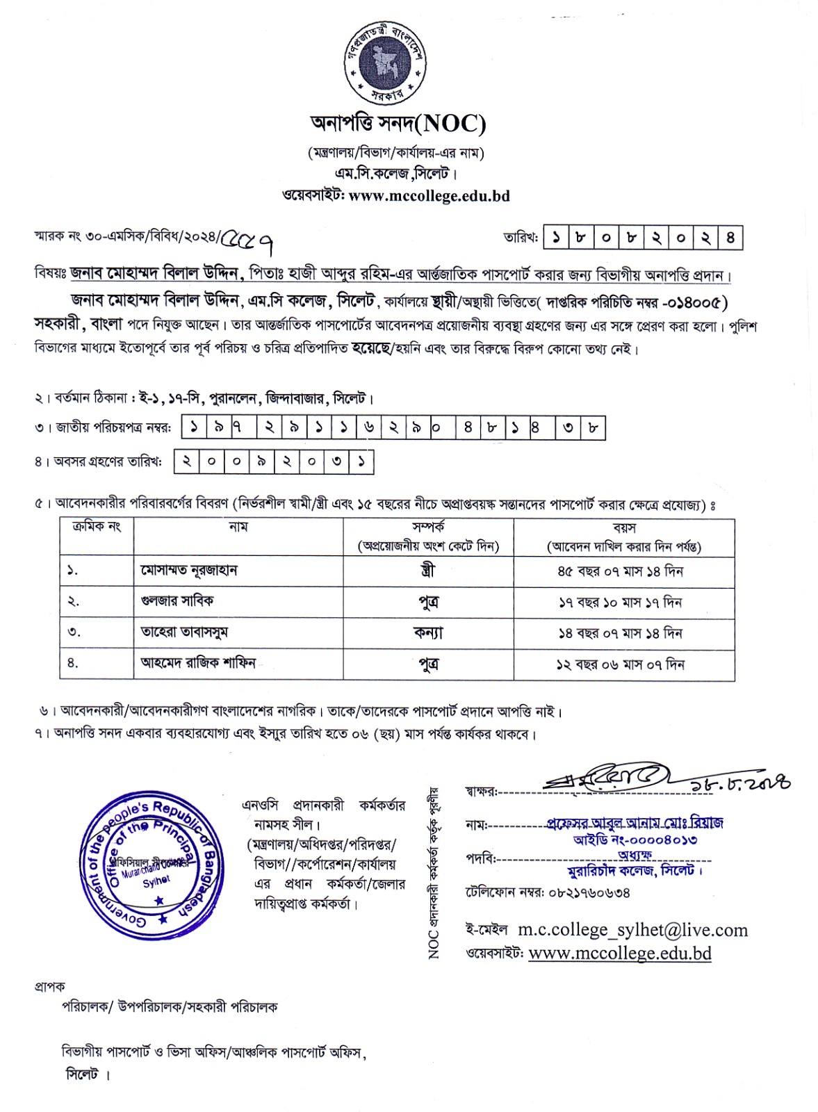 জনাব মোহাম্মদ বিলাল উদ্দিন এর এনওসি MC College