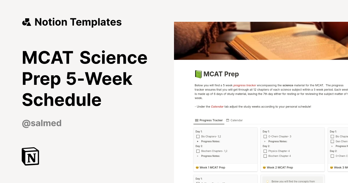 MCAT Science Prep 5 Week Schedule Template by Sal Notion Marketplace